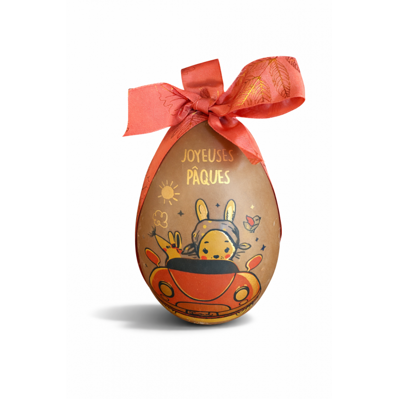Oeuf décoré en chocolat au lait goût caramel garni de friture et d'oeufs