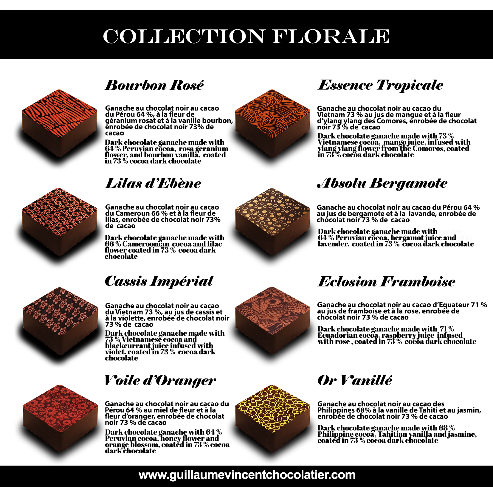 Cette collection est composée de 8 ganaches : cassis/violette, lavande et jus de bergamote, framboise/rose, …