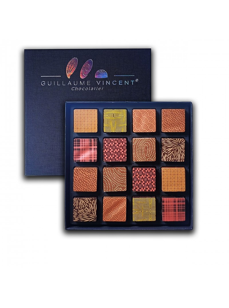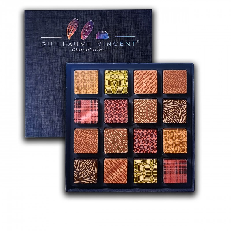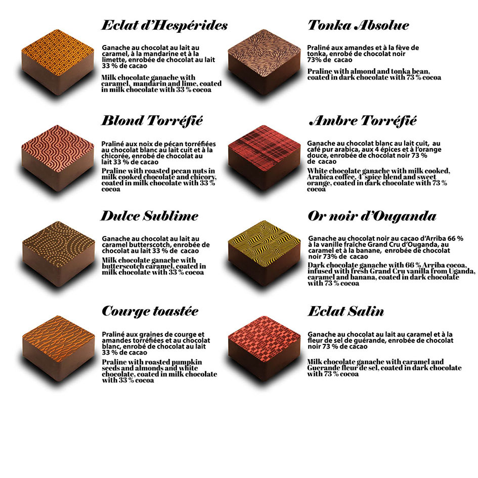 La richesse organoleptique de cette collection s'exprime à travers des textures contrastées : l'onctuosité du chocolat au lait cuit, la générosité d'un caramel au beurre, la force d'un praliné croquant ou encore la finesse d'un accord fruité relevé d'épices.