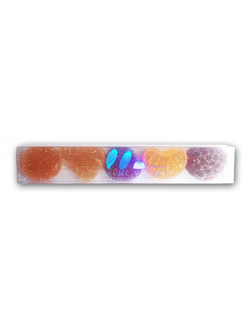 Assortiment de 5 pâtes de fruit : abricot, poire, mandarine, fraise, framboise