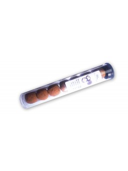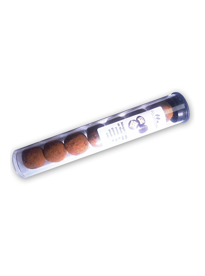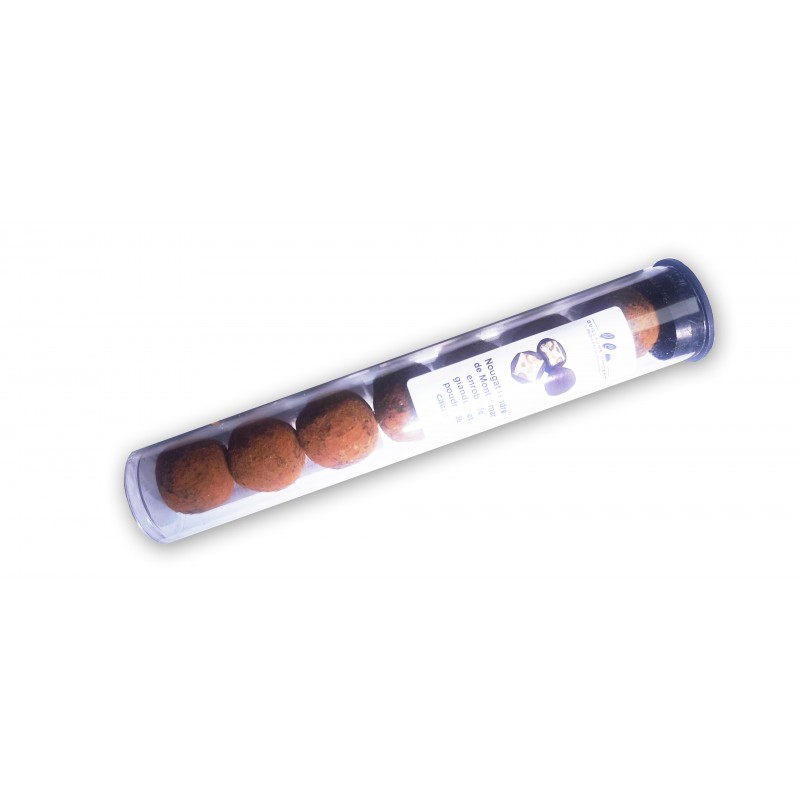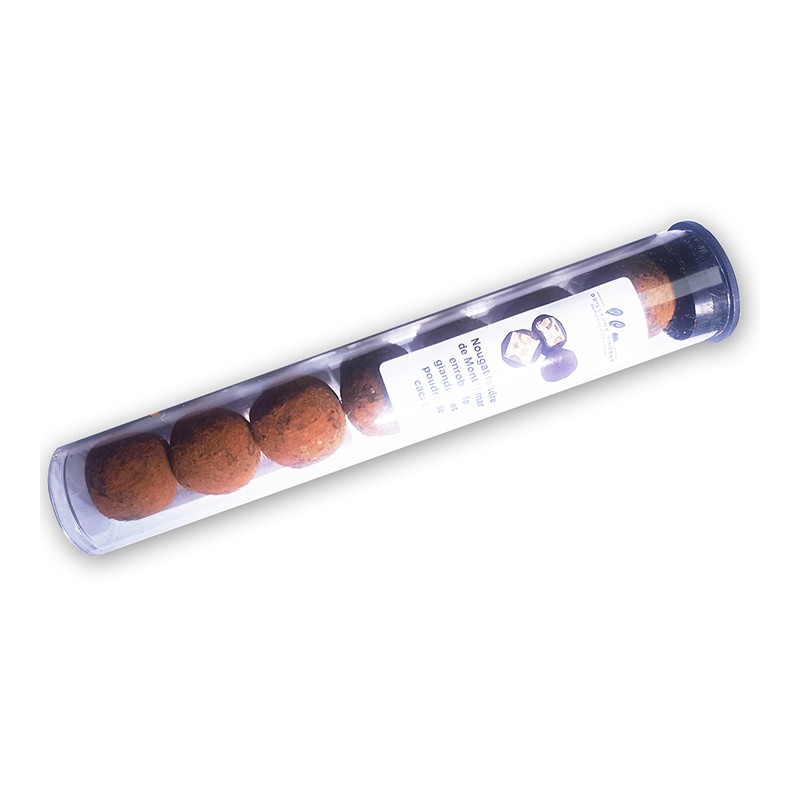 Billes de nougat tendre enrobées de gianduja et poudrées de cacao