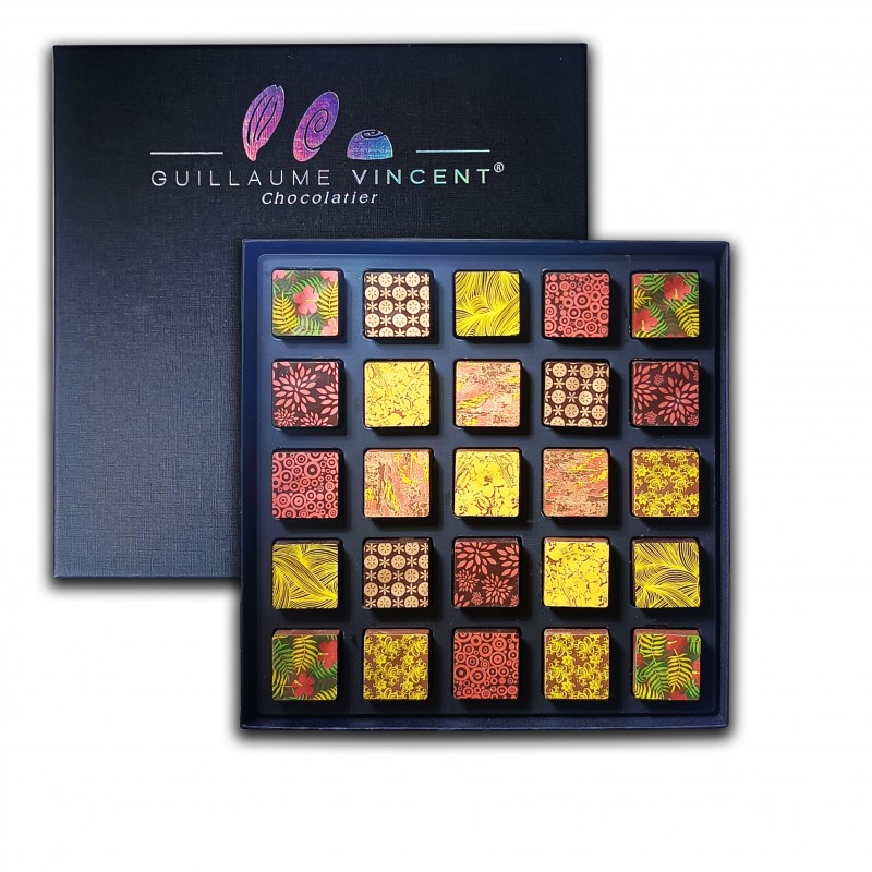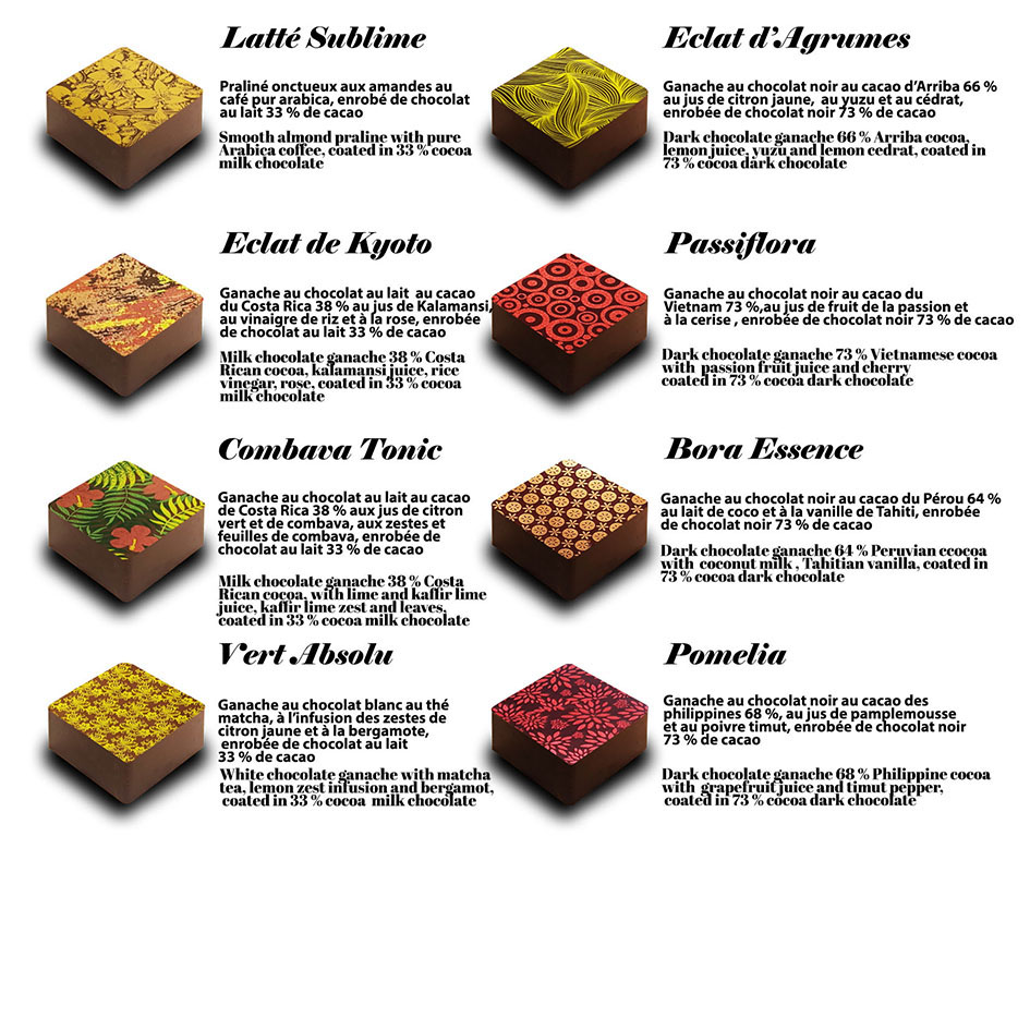 Les ganaches associent des ingrédients d'exception : yuzu et cédrat lumineux, fruit de la passion intense, cerise charnue, pomelo éclatant, kalamansi acidulé, gingembre frais, thé matcha raffiné ou encore lait de coco et vanille de Tahiti. Chaque fruit, chaque note végétale est travaillée comme une nuance aromatique, dans un jeu d'équilibre subtil qui évoque la parfumerie et l'art culinaire.