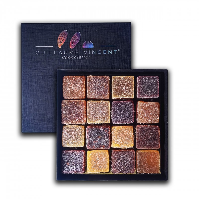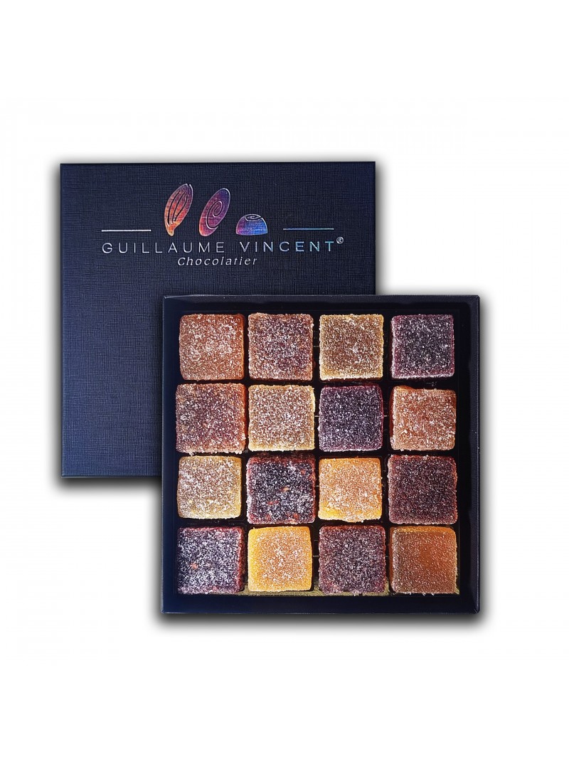16 pâtes de fruits sélectionnées parmi 10 sortes différentes : Figue, pamplemousse, groseille, clémentine, mûre, coing, mirabelle, pomme verte, fraise des bois, cassis