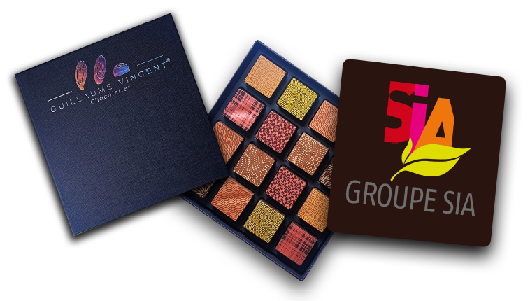Nous apposons votre logo sur nos chocolats et plaquettes de différents formats avec une exigence absolue du détail