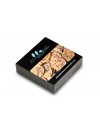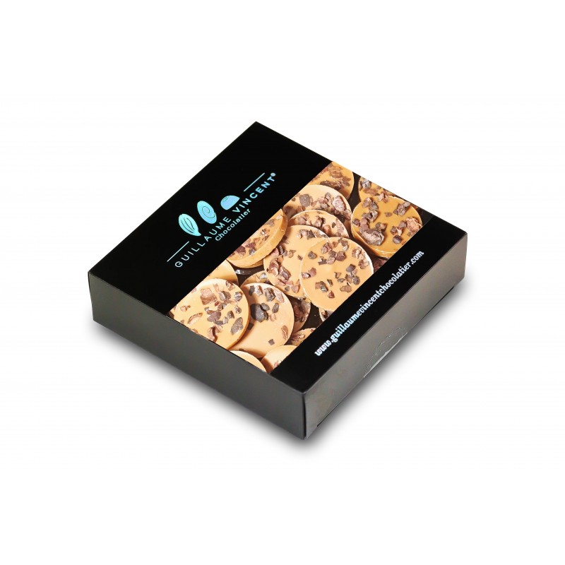 De délicats palets réalisés en chocolat ambré, un chocolat blanc subtilement caramélisé au goût de lait cuit. Leur douceur onctueuse contraste avec le croquant des grués de cacao torréfiés, parsemés à la surface.